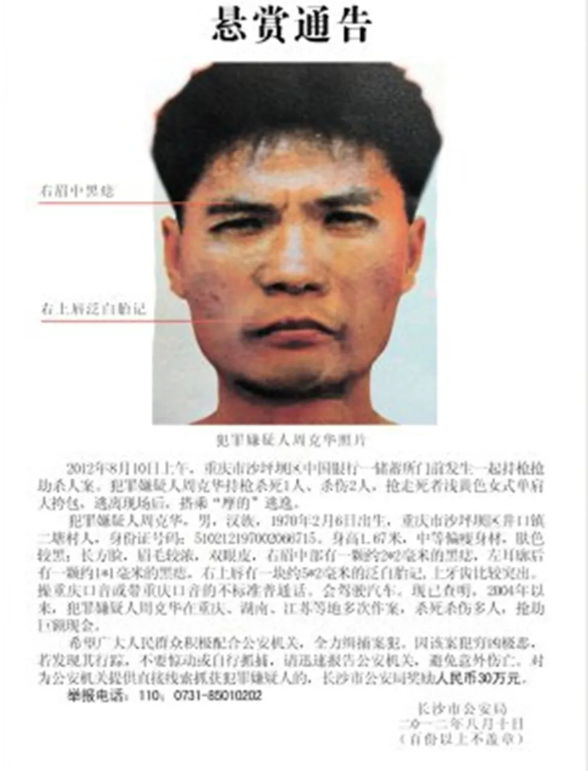 8月10日,重庆市公安局发布了最高等级的A级通缉令,悬赏50万元捉拿周克华,并印发了186万份传单贴遍重庆市的大街小巷,电视上滚动播放关于周克华的通缉令。