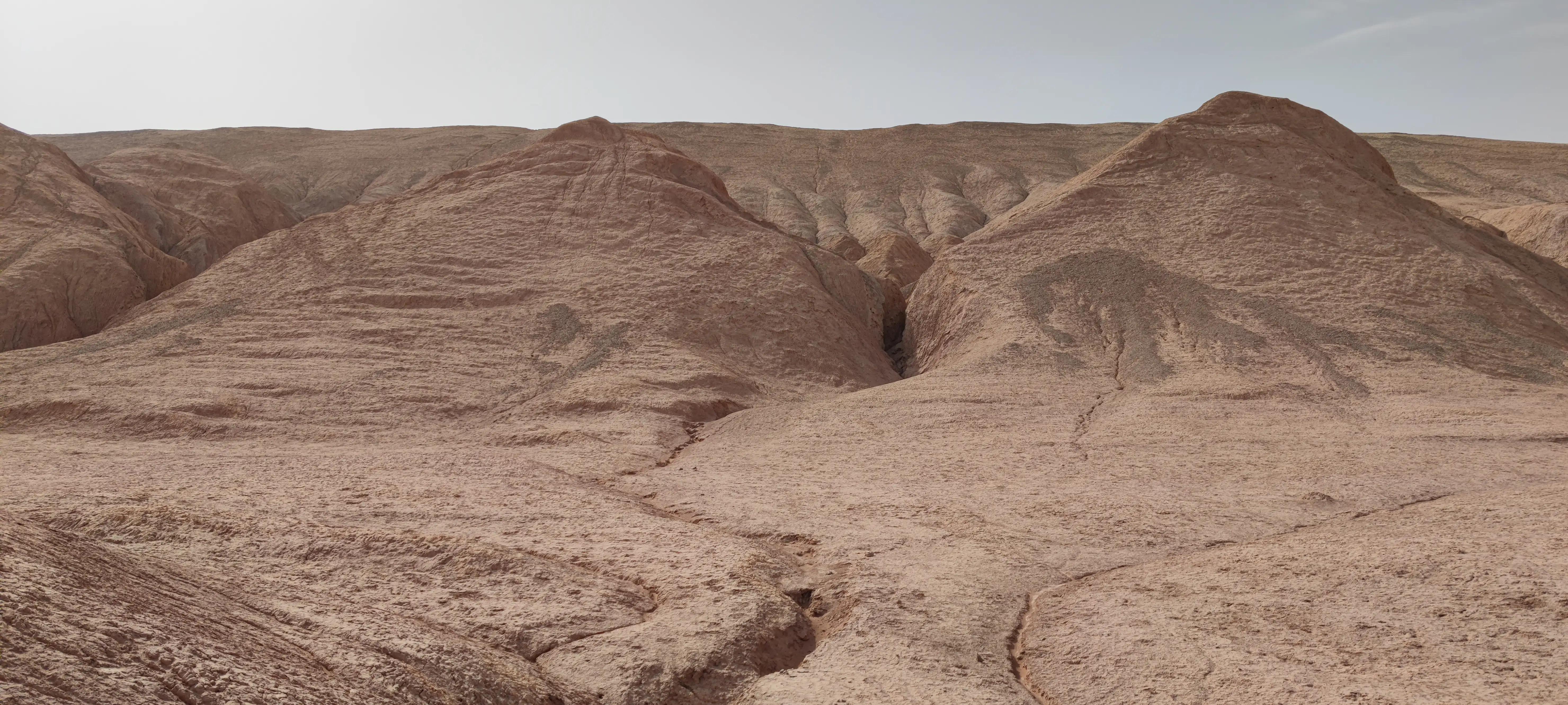 火焰山南北七八公里,徒步穿越需要翻越好几个山头,或峡谷,或山脊,或沙地,或石砾…一路灰尘土脸,下到山底从景区回望走过的路,真厉害!!!