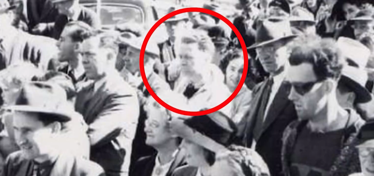 为此它还供了一张照片,作为他是时间旅行者的证据,就是这张照片,不知道大家有没有印象?这是20世纪40年代初加拿大南叉桥的重新开放,拍摄的照片,他表示那个带着墨镜的是他的同事,而旁边穿着现代服装的神秘男子就是他。